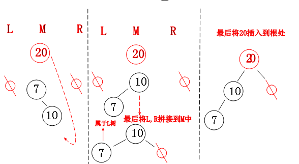 左孩子放入到L树的right节点,"节点10”作为中间树M,最后将20插入根节点。
