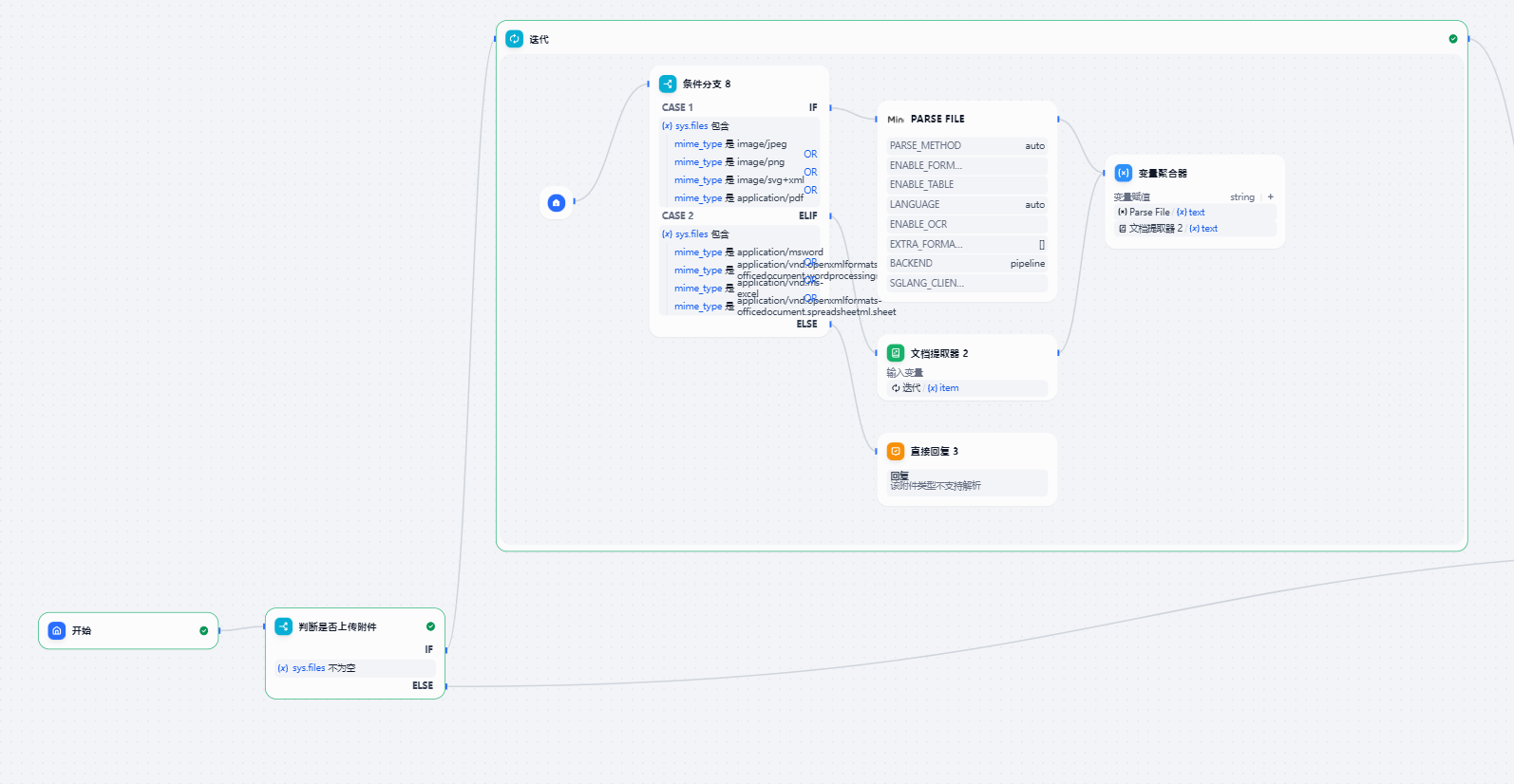 基于此,我们需先对上传文件类型进行分类,以便采用对应方案解析。具体实现可借助起始节点内置的系统变量 “sys.files”(支持单文件与多文件上传),后续衔接 “条件判断” 节点:当有文件时,通过判断文件的 MIME 类型(dify中常用到的mime类型-优快云博客)触发针对性内容提取,再结合用户问题与提取内容生成答复;若无文件上传,则直接依据问题结合上下文内容进行回应。