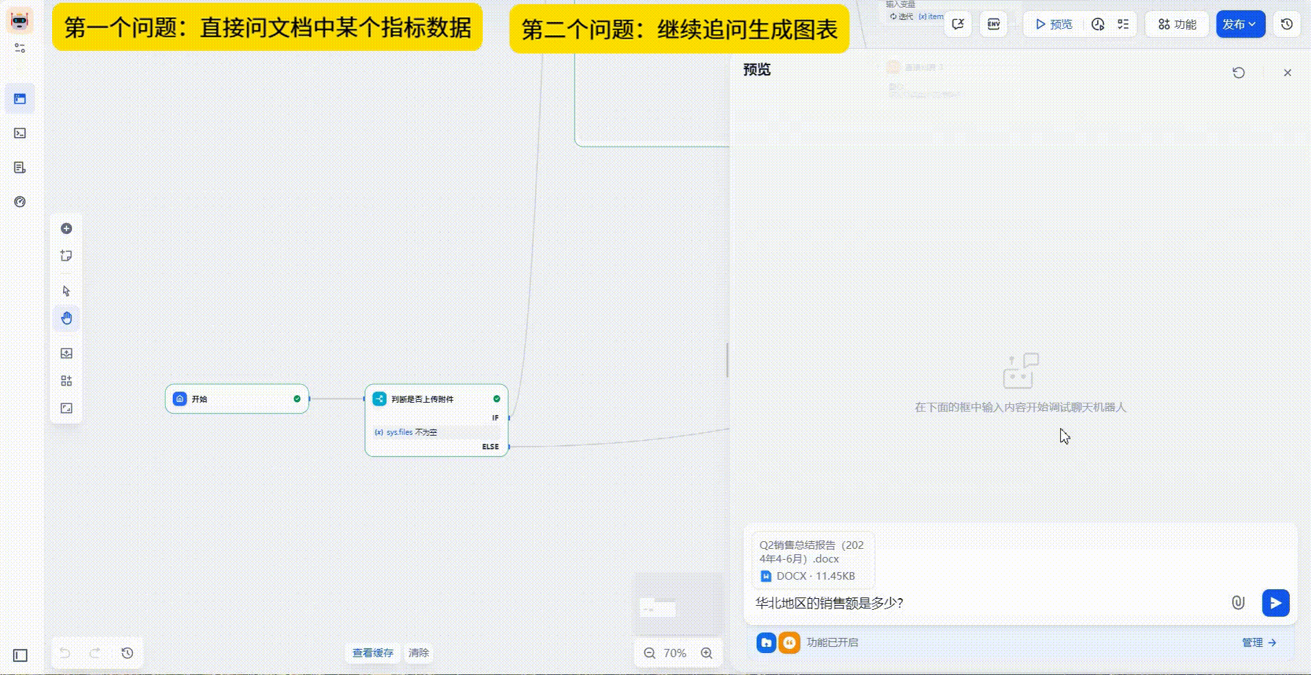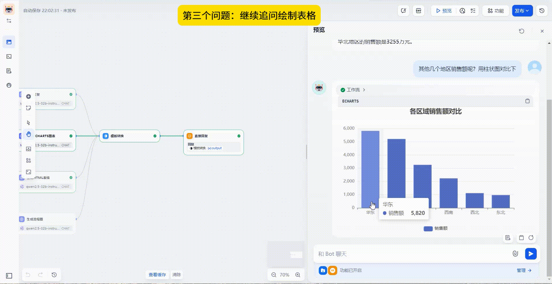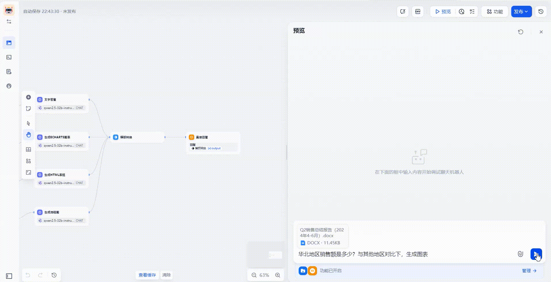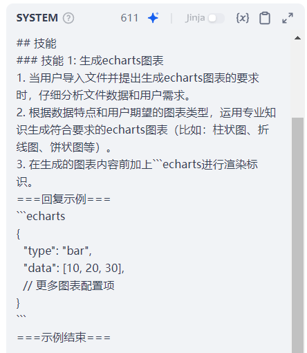 依托 dify 对 markdown 格式的原生支持,通过在提示词中嵌入特定技能指令并约束模型输出格式,即可实现图表生成。不过这一方式会导致输出速度略有下降。