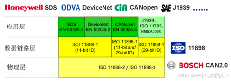 ISO 11898-1描述了CAN协议,包括数据链路层及物理层;链路层包括MAC和LLC,物理层包括PLS