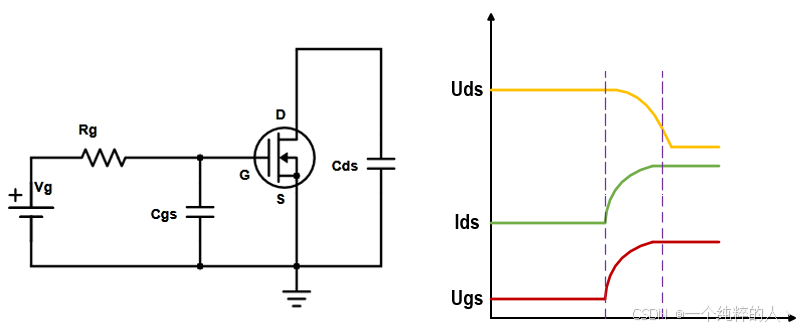 此时在栅极加电压,Cgs开始充电,Ugs上升,由于Rg的作用,充电电流越来越小,Ugs上升的速度越来越慢,即dUgs/dt越来越小。