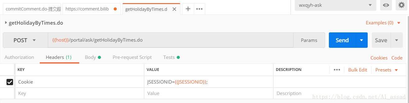 环境变量、全局变量的可以在 URL,Headers,Body 中引用,甚至可以引用其他的变量,引用使用 {{ var_name }} 的格式,如上图上,localhost 和 release-host 分别对应 本地、测试环境,我全部的请求 url 都设置为类似:{{host}}/portal/ask/getHolidayByTimes.do , 这样可以通过修改 host 的的引用值,在本地环境和测试环境之间快速切换;