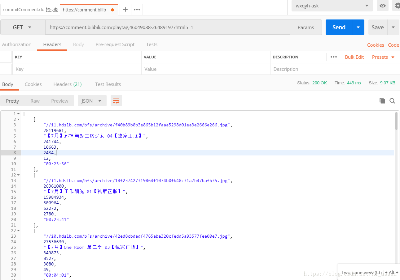 使用 postman 发送一个 HTTP 请求十分简单,只需设置好请求 URL、请求方法、请求头、请求正文即可,如下以获取 b 站的动画详情页 tag 推荐接口:https://comment.bilibili.com/playtag,46049038-26489197?html5=1 为例: