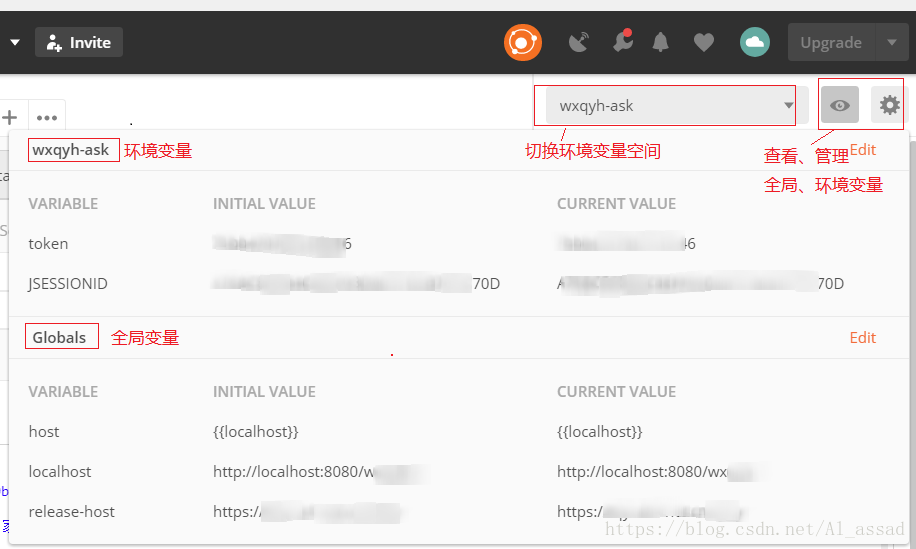 postman 提供全局变量和环境变量的概念,全局变量可以用于所有请求中,环境变量可以用于某个环境变量空间下的所有请求,每一个环境变量空间的环境变量都是独立的;