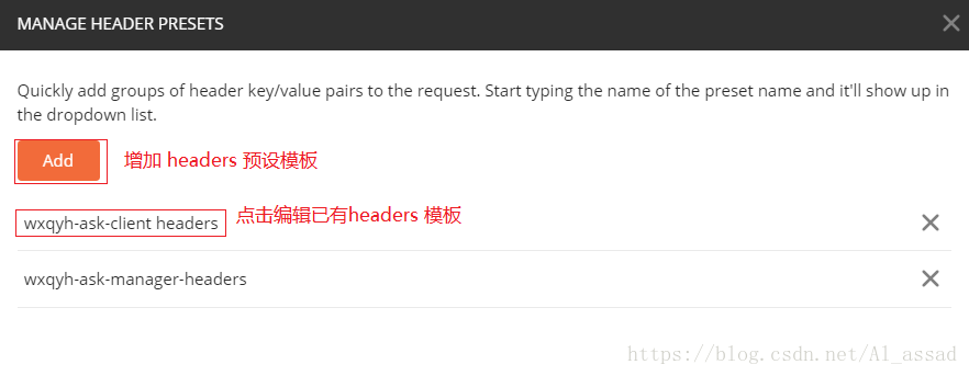 其中对于常用的 headers ,可以通过 Presets -> Manage Presets 来编辑管理自己常用的 headers,需要使用直接点击 Presets 就可以快速调出这些 headers 预设模板;