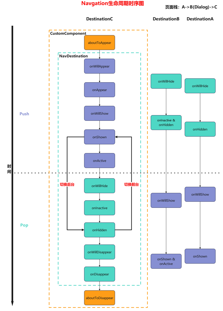这里展示了一个页面进栈出栈的相对生命周期(C页面相对于B和A)和绝对生命周期(C页面),其中B页面是Dialog页面(后面详细介绍),C页面是栈顶页面,A和B页面是栈中页面。