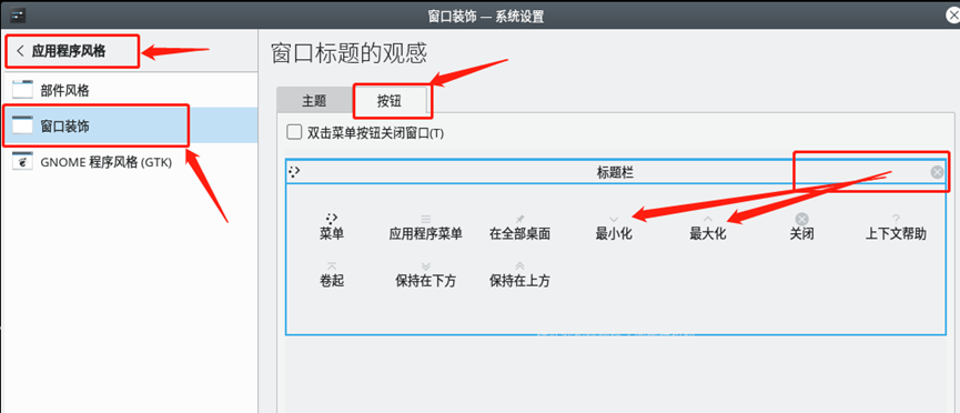 在系统设置里面->应用程序风格->窗口装饰->按钮,在这个设置页面里面,可以对标题栏的风格进行修改.拖动框里面的各按钮放到标题栏上就可以增加按钮.同理,往下拖就可以移除按钮.