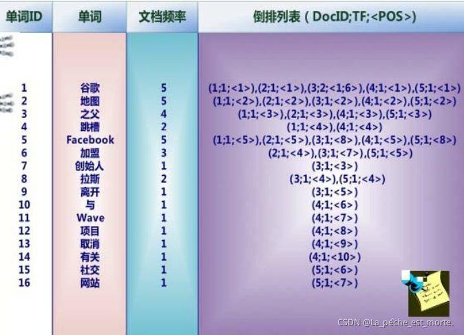 倒排列表:列表记载出现过这个单词的所有文档的文档列表及其单词在该文档的位置信息,也就是横着看一条数据.