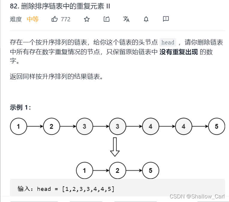当下一个节点的值等于下下一个节点的值时,我们跳过下一个节点,当前节点的next指针直接指向下下一个节点,但是这也导致一个问题:比如1,2,2,,2,3,4,5这样的序列,我们需要去除2,但是只能删除前面的'2',无法删除最后的'2',如何解决这一问题呢?我们可以通过一个变量X记录重复值,我们每次判断cudr->next的值是否等于X(前提是cur存在),入股cur->next存在且cur->next->val==X,那么我们令cur->next=cur->next->next