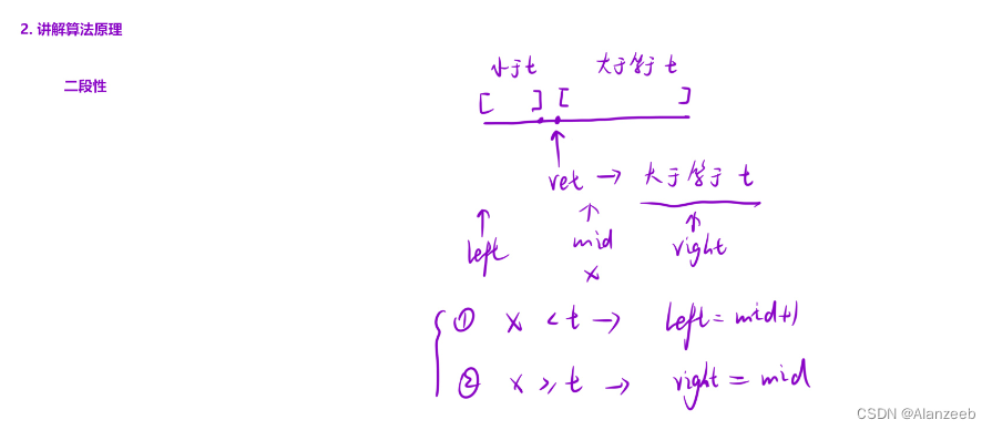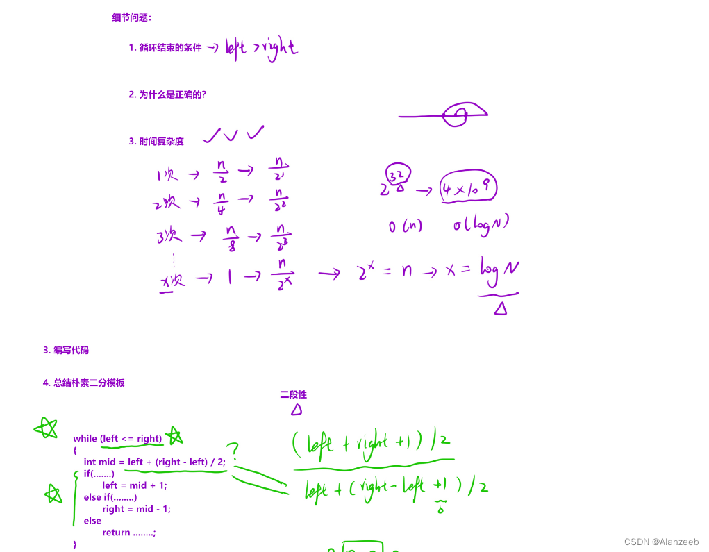 只要写出左右端点模板即可完成编码,当判断左右端点时,如果是mid+1则mid为left+(right-left)/2,如果是mid-1则mid为left+(right-left+1)/2。