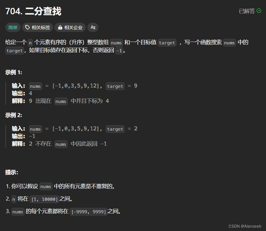 就拿这一题来讲解朴素模板:704.二分查找
