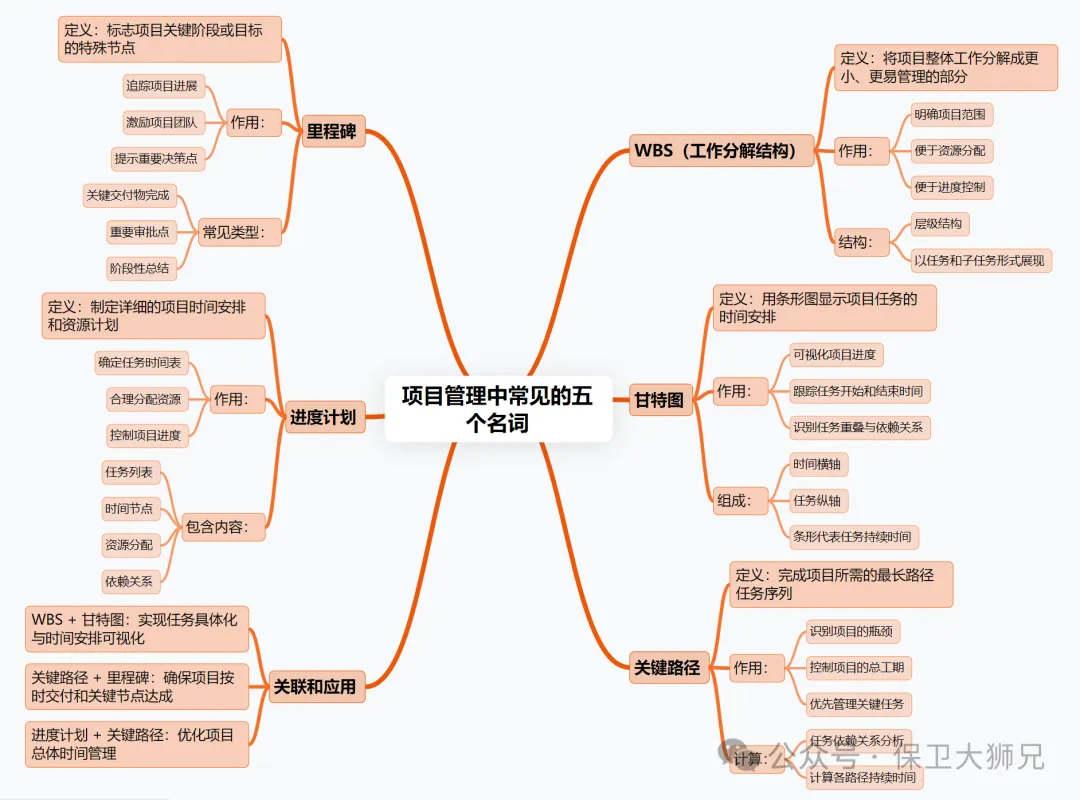 一句话总结: WBS 拆任务,Schedule 排时间,甘特图看进度,里程碑检查节点,关键路径保命脉。