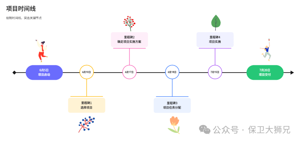 每个里程碑要有明确的验收标准,比如“需求文档已评审并通过”,而不是“需求差不多了”。