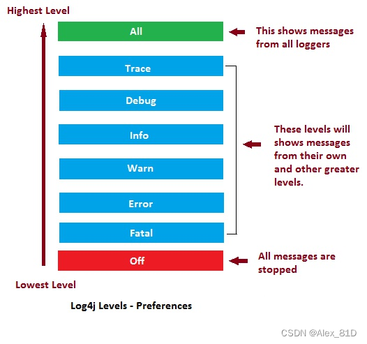 ALL < TRACE < DEBUG < INFO < WARN < ERROR < FATAL < OFF