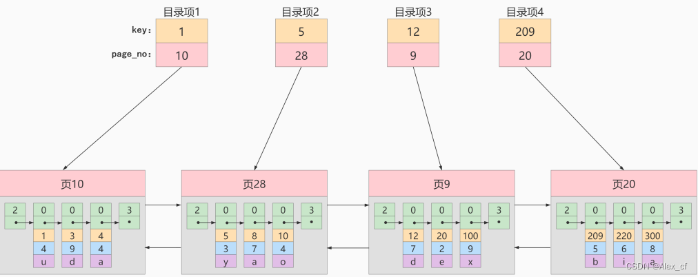 2. 再根据前边说的在页中查找记录的方式去 页9 中定位具体的记录。 至此,针对数据页做的简易目录就搞定了。这个目录有一个别名,称为 索引 。