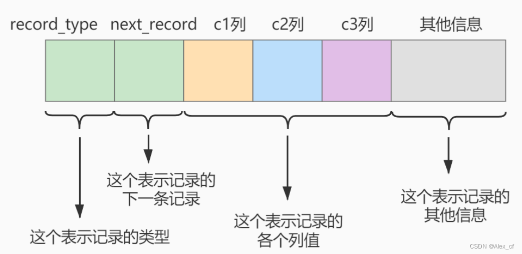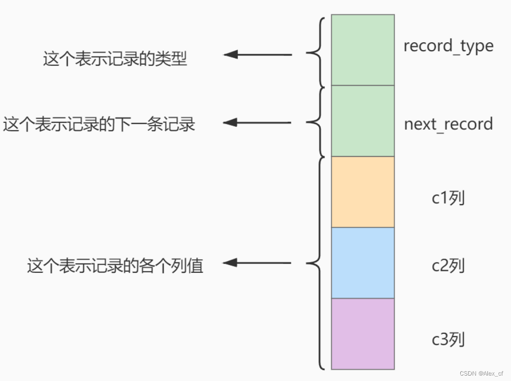 - next_record :记录头信息的一项属性,表示下一条地址相对于本条记录的地址偏移量,我们用 箭头来表明下一条记录是谁。
