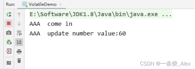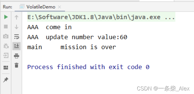 * 最后线程没有停止,并且没有输出 mission is over 这句话,说明没有用volatile修饰的变量,是没有可见性