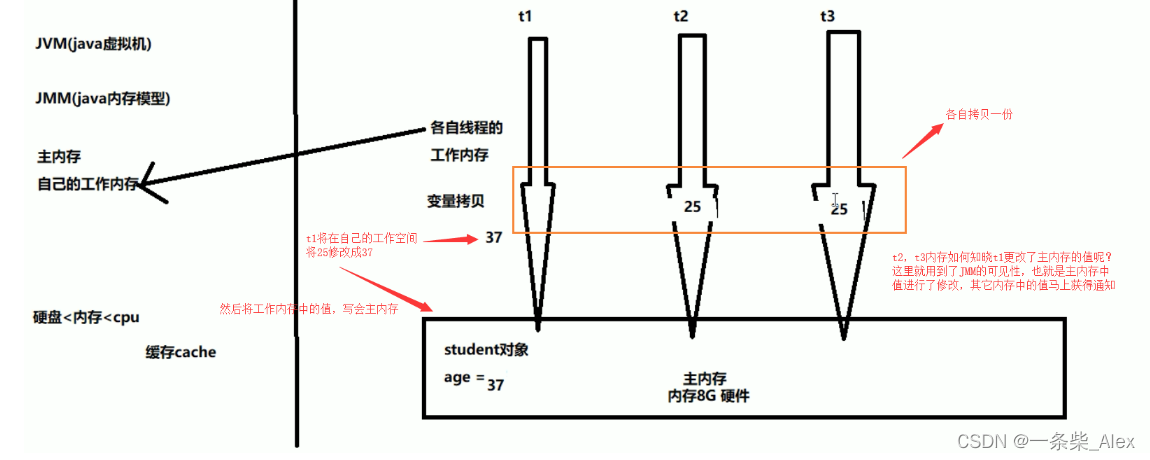 - 当同时有三个线程同时访问 student中的age变量时,那么每个线程都会拷贝一份,到各自的工作内存,从而实现了变量的拷贝