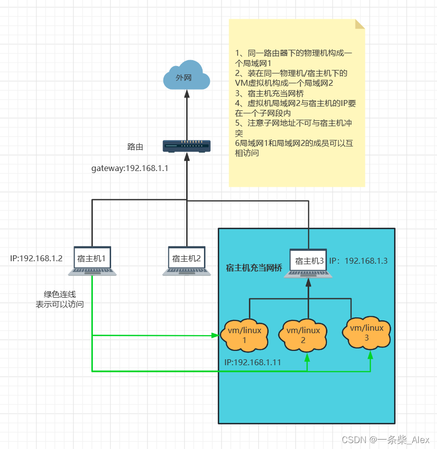 桥接模式:宿主机充当一个网桥,虚拟机的网段要和宿主机保持一致。