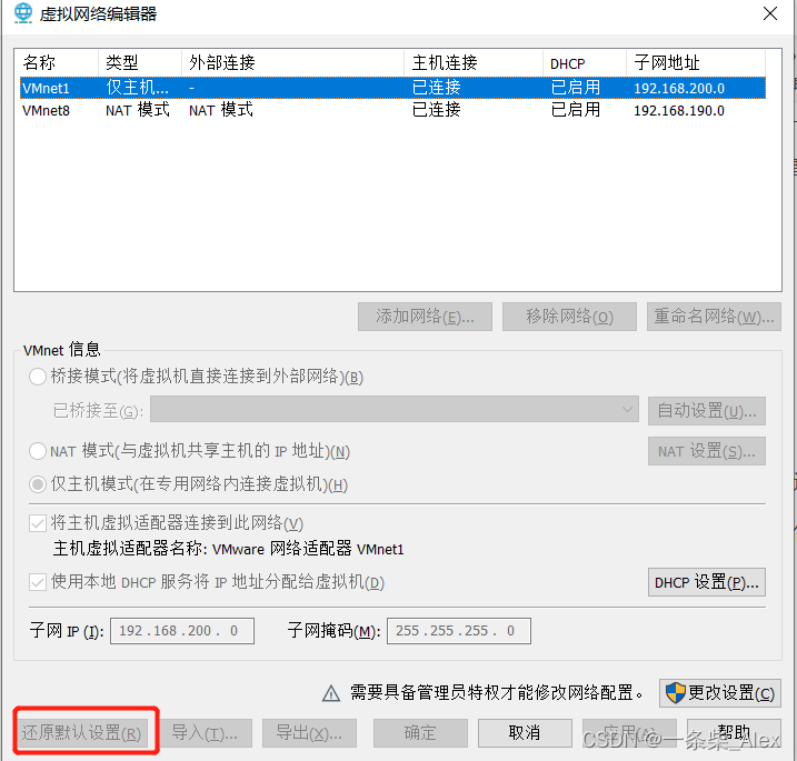 2、Vmware工具栏 【编辑】——>【虚拟机网络设置】——>【还原默认设置】