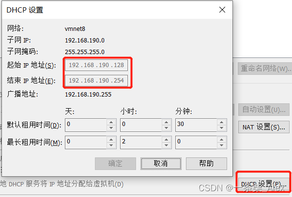 我们可以通过虚拟机dhcp设置,看看动态获取的IP的范围,防止我们自己固定IP的时候,越界