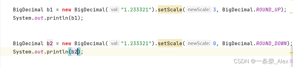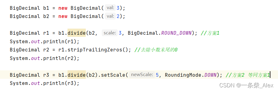 除了上述的四则运算,和值输出以外,BigDecimal 更常用的是 取一个数的某一部分,可以是取整数,也可以规定保留的精度