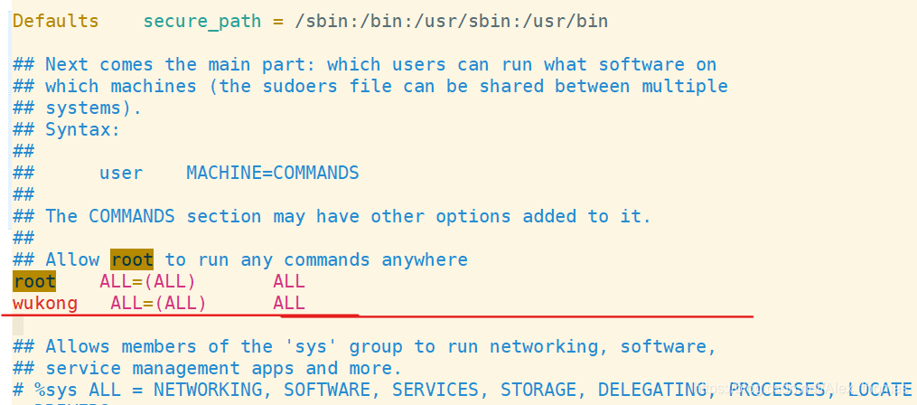 2.在配置文件中添加wukong用户使用sudo的权限,并添加横线上的信息,如图示: