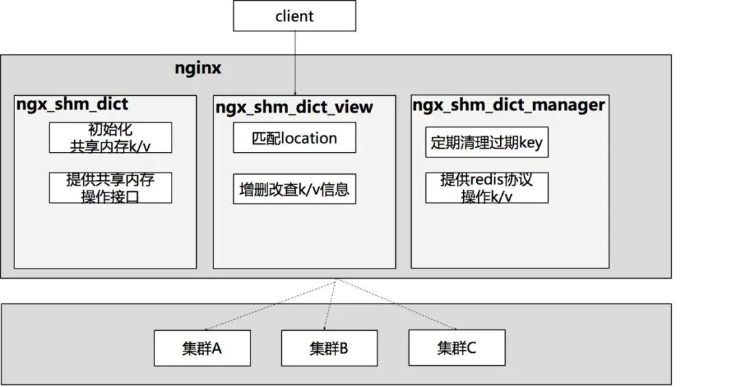 ngx_shm_dict:共享内存核心模块(红黑树,队列)ngx_shm_dict_manager:添加定时器事件,定时的清除共享内存中过期的 Key,添加读事件,支持 Redis 协议,通过 redis-cli get,set,del,ttlngx_shm_dict_view:共享内存查看