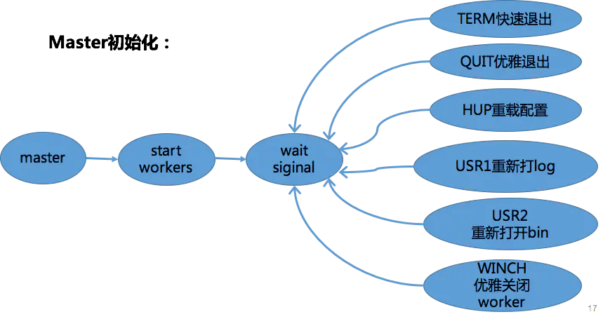 Master 进程:监视工作进程的状态;当工作进程死掉后重启一个新的;处理信号和通知工作进程。