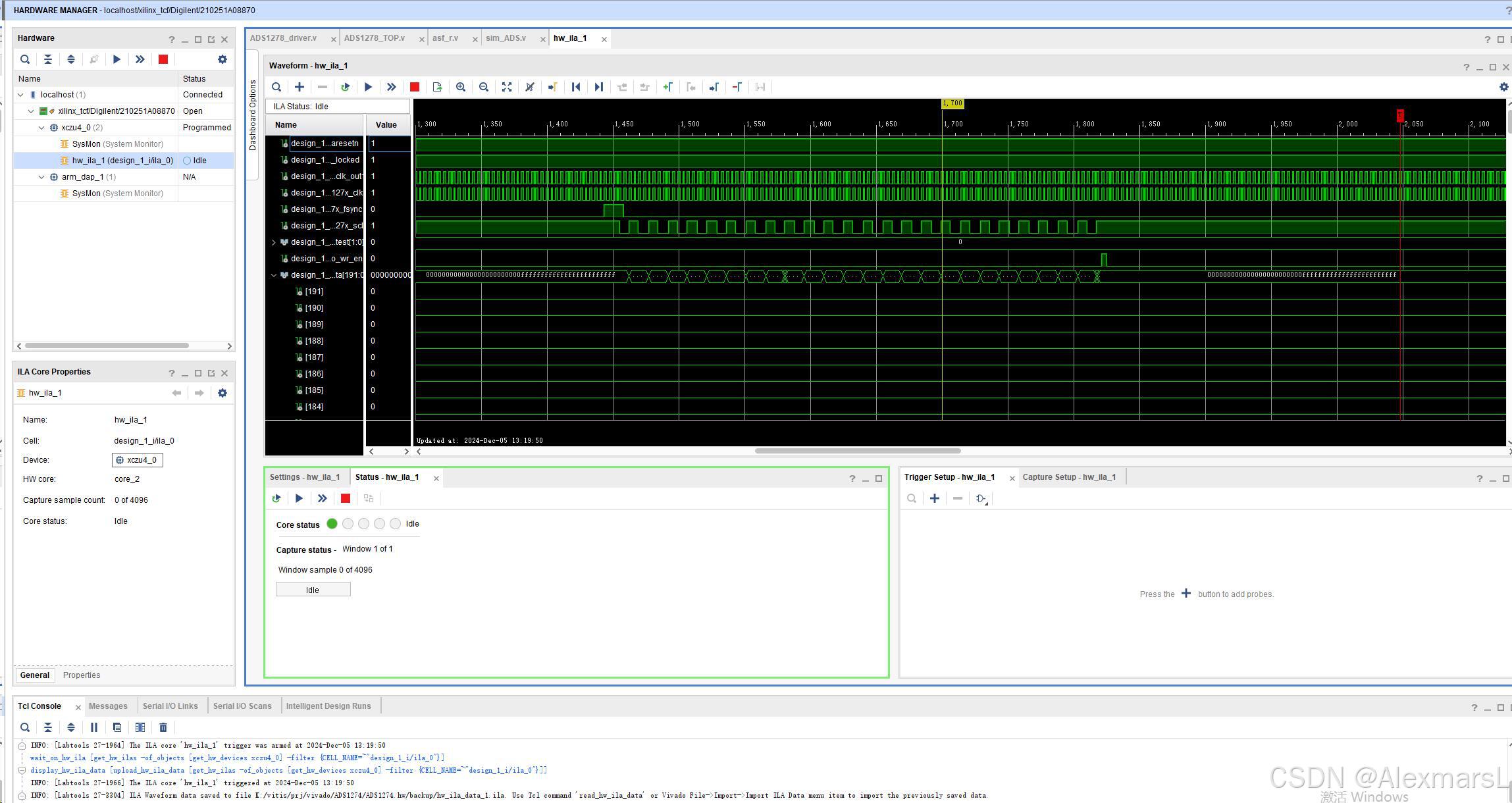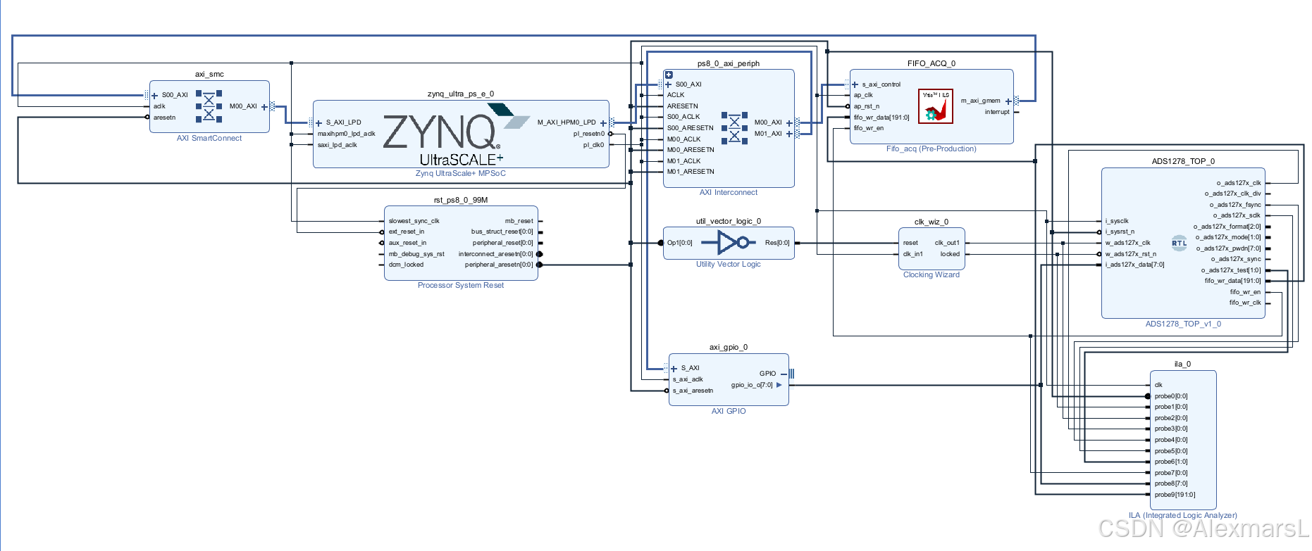module ADS1278_TOP( input i_sysclk , input i_sysrst_n , input w_ads127x_clk , input w_ads127x_rst_n , // 外部锁定信号输入 output o_ads127x_clk , output o_ads127x_clk_div , output o_ads127x_fsync , output o_ads127x_sclk , input [7 :0] i_ads127x_data , output [2 :0] o_ads127x_format , output [1 :0] o_ads127x_mode , output [7 :0] o_ads127x_pwdn , output o_ads127x_sync , output [1 :0] o_ads127x_test , // 添加 FIFO 写端口 output [191:0] fifo_wr_data, // FIFO 写数据 output fifo_wr_en, // FIFO 写使能 output fifo_wr_clk // FIFO 写时钟 // input fifo_wr_full // FIFO 写满标志(可选 ); /***********************网线型**************************/ wire w_sysrst_n ; /***********************例 化**************************/ arsf_module arsf_module_u0( //复位处理:异步复位,同步释放 .i_sysclk (i_sysclk ), .i_sysrst_n (i_sysrst_n ), .o_rst_n (w_sysrst_n ) ); /******************************************************/ wire [191 : 0] w_ads1278_rdata ; wire w_user_rdata_valid; wire w_user_rdata_ready; assign w_user_rdata_ready = w_user_rdata_valid; /******************************************************/ ads1278_drive#( .P_ADS127X_MODE (2'b01 ), //模式设置参数 0-快速 1-精准 2-低功耗 3-超低速 .P_ADS127X_PWDN (8'b1111_1111 ) //通道开关参数 1-开启 0-关闭 ) ads1278_drive_u0 ( .i_sysclk (i_sysclk ), //输入系统时钟 .i_sysrst (~w_sysrst_n ), //输入系统复位 .w_ads127x_clk (w_ads127x_clk) , .w_ads127x_rst_n (w_ads127x_rst_n), // 外部锁定信号输入 .o_ads127x_clk (o_ads127x_clk ), //ADS127X芯片驱动时钟 .o_ads127x_clk_div (o_ads127x_clk_div ), //ADS127X芯片时钟分频设置 .o_ads127x_fsync (o_ads127x_fsync ), //ADS127X芯片帧同步(AD转换控制) .o_ads127x_sclk (o_ads127x_sclk ), //ADS127X数据时钟 .i_ads127x_data (i_ads127x_data ), //ADS127X的8通道数据输入 .o_ads127x_format (o_ads127x_format ), //ADS127X通信格式设置 .o_ads127x_mode (o_ads127x_mode ), //ADS127X工作模式设置 .o_ads127x_pwdn (o_ads127x_pwdn ), //ADS127X通道开关 .o_ads127x_sync (o_ads127x_sync ), //ADS127X多片同步 .o_ads127x_test (o_ads127x_test ), //ADS127X测试模式设置 // 添加 FIFO 写端口 .fifo_wr_clk (fifo_wr_clk), // FIFO 写时钟 .fifo_wr_data (fifo_wr_data), // FIFO 写数据 .fifo_wr_en (fifo_wr_en) // FIFO 写使能 ); endmoduleBD设计:因为要用ZYNQ传PS处理,所以要进行block design,基本思路是RTL部分采集然后FIFO暂存通过AXI传输至PS端,RTL采集代码直接拖进BD,因为我比较懒不想写verilog仿真测试验证了,PL与PS互联这里我直接用HLS封装了一个FIFO和MAXI接口的IP核,为了方便调试查问题,生成了一个ILA抓波形,然后在输出端添加了一个AXI GPIO控制输出模拟数据给AD采集,最后生成比特流准备上开发板测试。