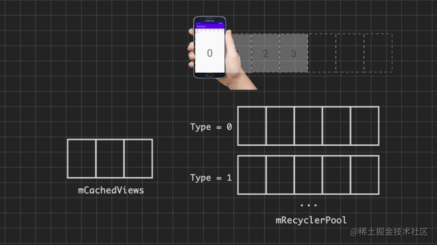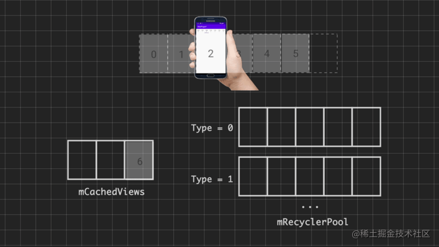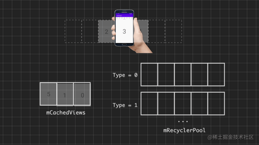 - 但是,由于超过了mCachedView大小的限制,在下一个被移出屏幕的position=2的页面项尝试进入时,会先按照先进先出的顺序,先从mCachedView中移出position=0的页面项,放入RecyclerPool中对应itemType的ArrayList容器中。