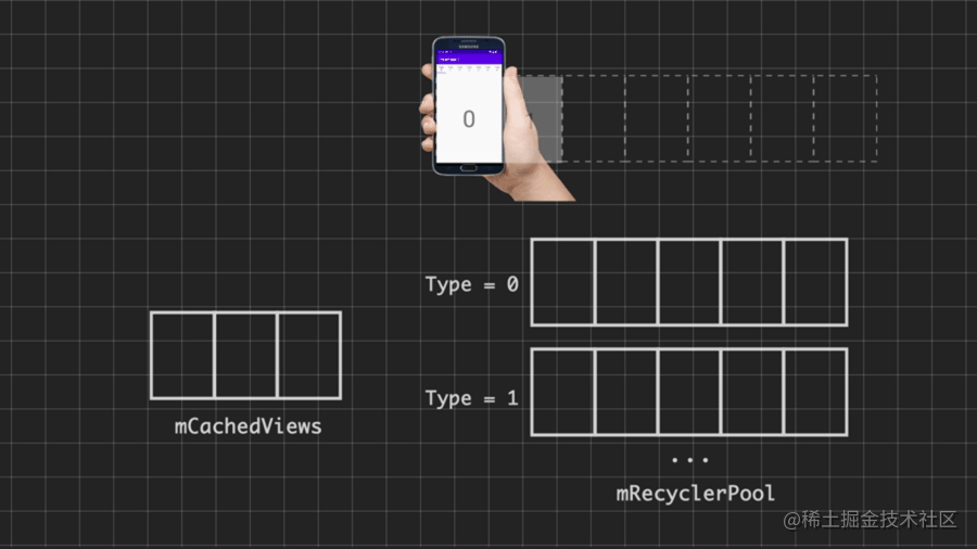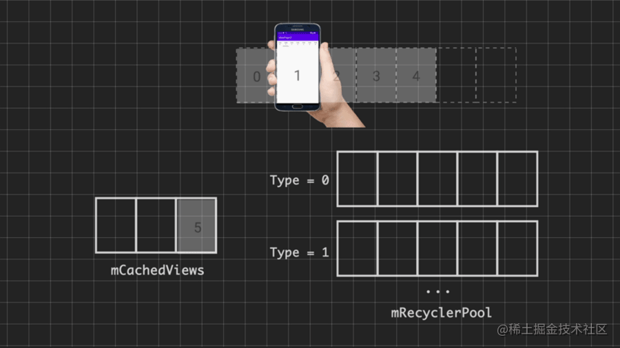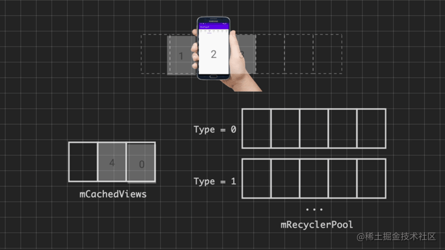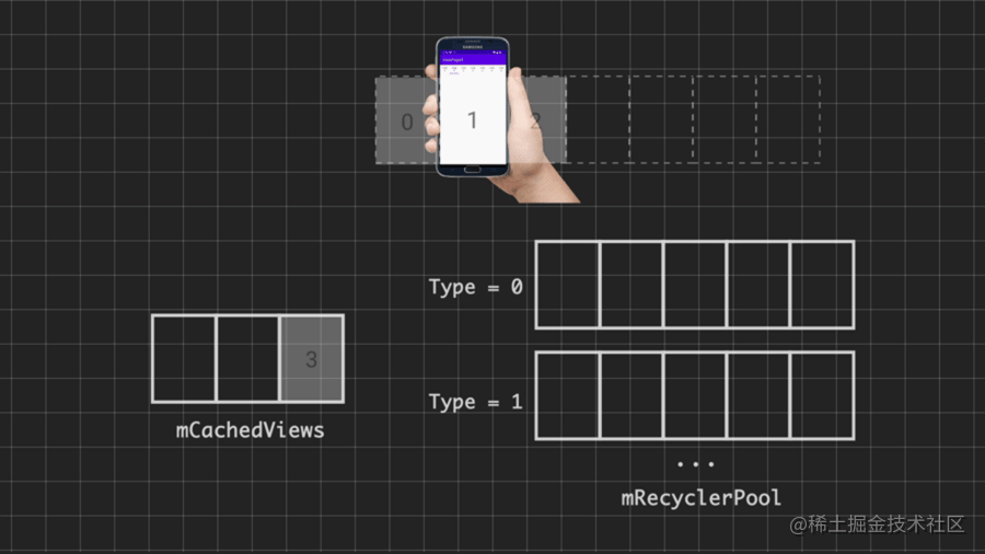 - 此时,由于还未超过mCachedView大小的限制,下一个被移出屏幕的position=1的页面项也将放入mCachedView中。