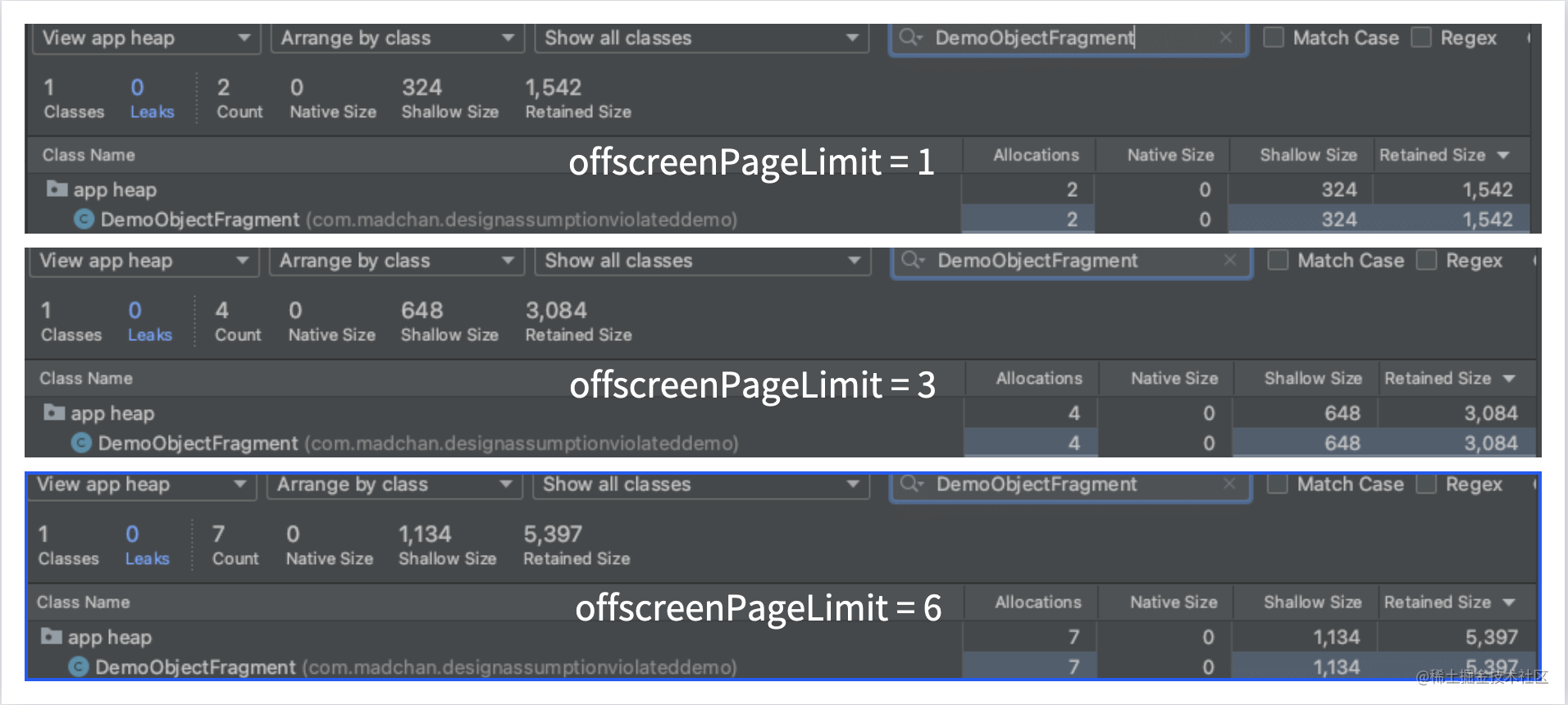可以看到,随着OffscreenPageLimit值的增加,在滑动视图的初始化阶段,会有更多的Fragment对象驻留在内存中。