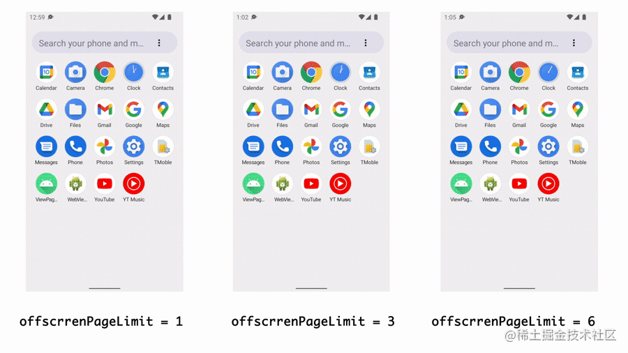 虽然设置更高的OffscreenPageLimit值,可以更好地提升ViewPager2滑动时的流畅度,但由于需要在初始化阶段同时创建多个页面项,意味着将花费更久的创建时间,页面项内容也将更慢显示,同时,由于两侧有更多的页面项被保留而不走缓存复用流程,意味着应用会占用更多的内存,且这些问题将随着页面复杂度提升更加突出。