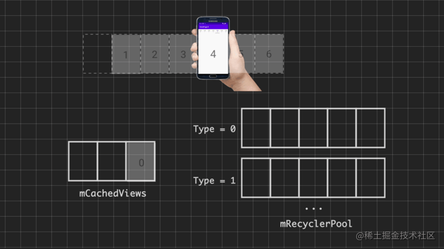 - 随着我们往左滑动屏幕,position=4的页面项会被添加至当前视图层次结构中,而position=0的页面项会继续保留在当前视图层次结构中,同时预拉取机制会开始工作,提前创建position=5的页面项并放入mCachedView中。