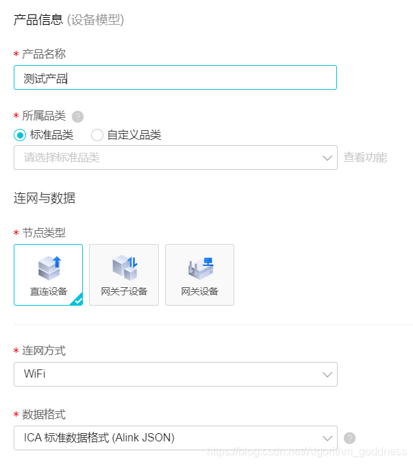 设备依托于产品,所以首先创建产品,产品名称自己定义,选择连网方式(WIFI)和数据格式(我选择的Alink JSON,虽然没有很了解这种格式,但是最终可以连接上)。