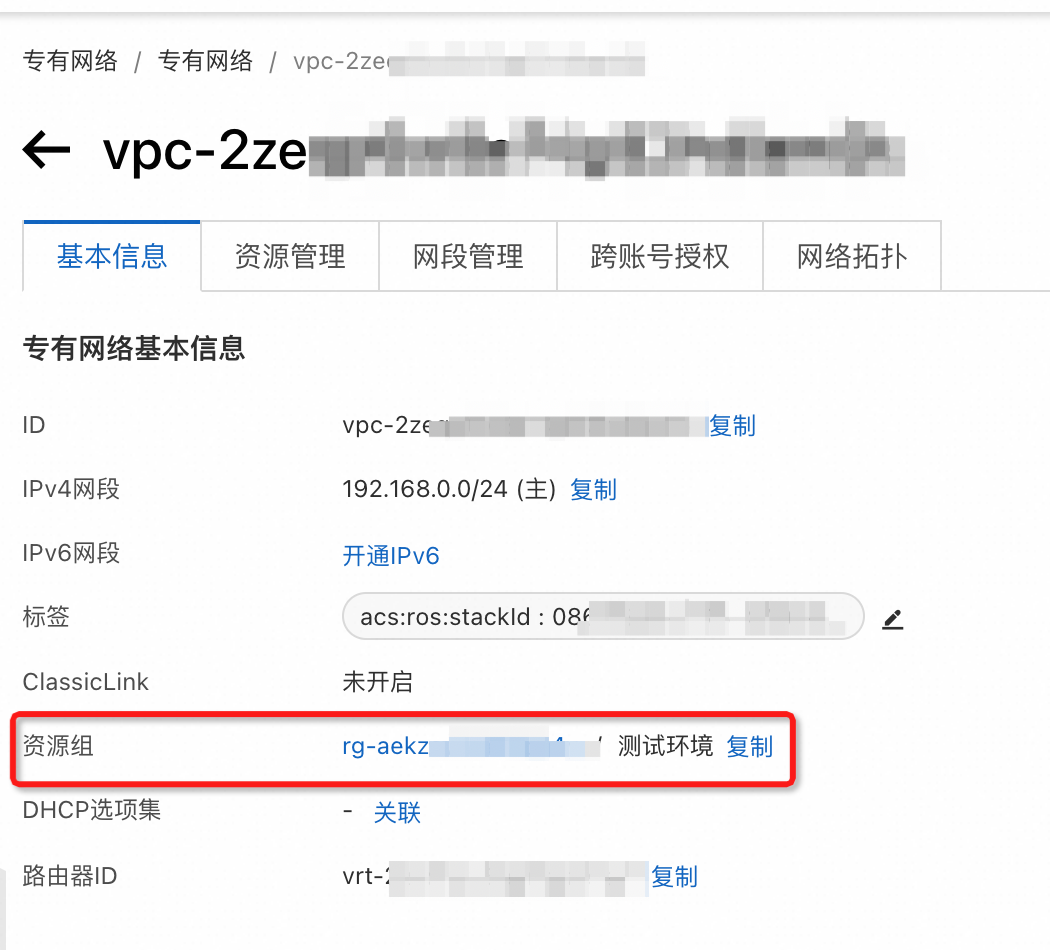 资源创建完成后可以进入资源详情页查看,验证资源组与上一步选择的一致: