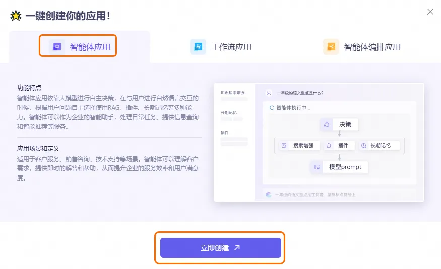 - 进入百炼控制台的应用列表,在页面右侧点击新增应用。在对话框中选择智能体应用,点击立即创建。