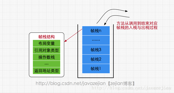 属于线程私有的数据区域,与线程同时创建,总数与线程关联,代表Java方法执行的内存模型。栈中只保存基础数据类型和自定义对象的引用(不是对象),对象都存放在堆区中。每个方法执行时都会创建一个栈桢来存储方法的的变量表、操作数栈、动态链接方法、返回值、返回地址等信息。每个方法从调用直结束就对于一个栈桢在虚拟机栈中的入栈和出栈过程,如下(图有误,应该为栈桢):