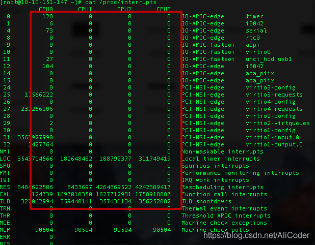 还可以通过查看/proc/interrupts来获取当前系统使用的中断的情况。