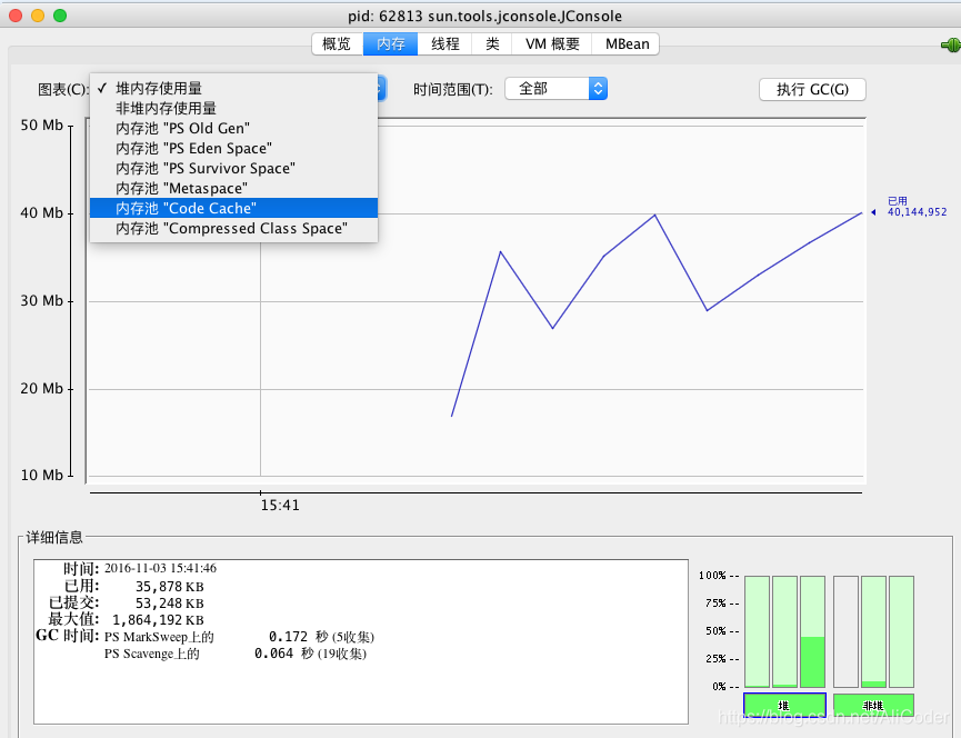 这个工具应该是Java开发者们非常熟悉的一款java应用监测工具,原理是通过jmx接口来连接jvm进程,从而能够看到jvm上的线程、内存、类等信息。  如果想进一步查看gc情况,可以安装visual gc插件。此外,visualvm也有btrace的插件,可以可视化直观的编写btrace代码并查看输出日志。 与VisualVm类似的,jconsole也是通过jmx查看远程jvm信息的一款工具,更进一步的,通过它还可以显示具体的线程堆栈信息以及内存中各个年代的占用情况,也支持直接远程执行MBEAN。当然,visualvm通过安装jconsole插件也可以拥有这些功能。  但由于这俩工具都是需要ui界面的,因此一般都是通过本地远程连接服务器jvm进程。服务器环境下,一般并不用此种方式。