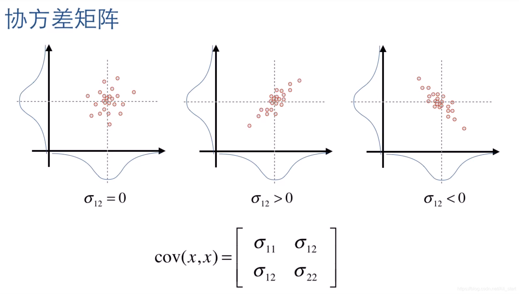 假设 x 、y 两个维度的随机变量具有相关性,x 随着 y 增大 协方差>0 。x 随着 y 减小 协方差<0