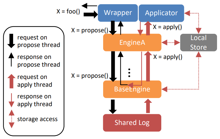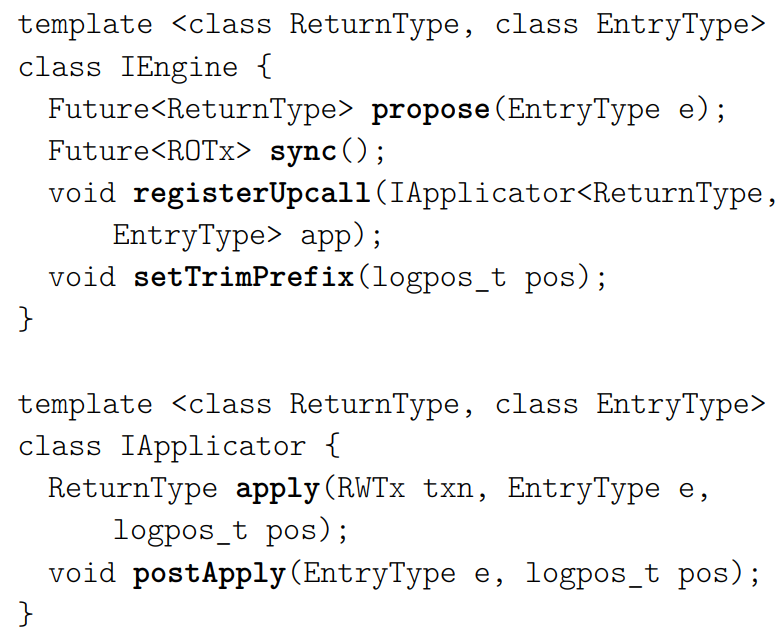 Log-Structured协议提供了一组接口,应用通过该接口与协议引擎进行交互。使用 IEngine接口,应用可以通过propose接口提议一个Entry到共享日志;registerUpcall注册一个Applicator的实例从共享日志接收新的Entry,一旦有新的Entry写入,该Applicator实例的apply接口将被调用;sync接口确保所有在共享日志中的Entry 都已经通知给了应用,并返回一个只读视图以便读取最新状态。应用则可以将其本地的状态保存到持久化的存储系统中,如RocksDB,论文里将其称为LocalStore。