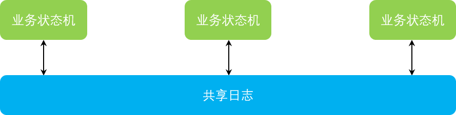 那么复制状态机系统还能否更进一步的抽象呢?考虑图2中的复制日志模块,它本质上是使用复制在多个节点间实现了日志共享,它抽象出来的实际上是一个共享日志的语义。因此我们可以将复制日志进一步的抽象成共享日志,如图3所示,业务状态机可以向底层的共享日志层写入新的日志,并可以从共享日志层读取日志来执行。业务状态机和共享日志可各自独立扩展,独立升级维护。