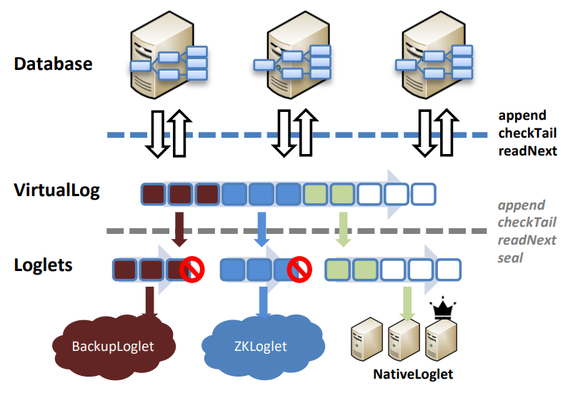 Virtual Log的抽象使得上层只用假设该Log里的每一个Entry都已经复制并持久化在不同的节点上,不用关心背后使用哪种共识协议实现的,甚至可以多种共识协议同时存在。一批连续的Log Entires被映射成一组物理共享日志,称为Loglet,对应一种共识协议或者使用某种共识协议实现的Log存储系统。