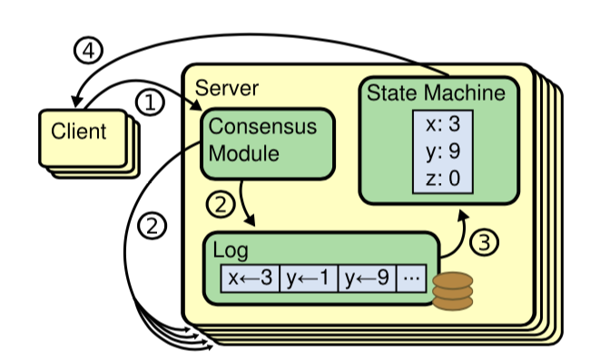 复制状态机(Replicated State Machine)是指多台机器具有完全相同的状态,运行完全相同的确定性状态机。它让多台机器协同工作犹如一个强化的组合,其中少数机器宕机不影响整体的可用性。