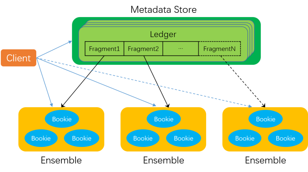 如图4所示,Apache BookKeeper包含三个核心组件:Client、Metadata Store和Bookie。Metadata Store负责保存Ledger和集群相关的元数据,Bookie则是系统的存储节点,负责Ledger里Entry的存储,Client则负责提供访问系统的接口。Ledger是BookKeeper的基本逻辑单元,包含了一系列连续的Entries,BookKeeper可以保证Entry顺序写入,并且最多被写入一次,Entry一旦被写入将不能被修改。一个Ledger被划分为多个Fragment,每个Fragment包含一组连续的Entries。Bookie负责Ledger的存储,实际是Ledger的Fragment的存储。每个Bookie保存了一个 Ledger的一部分Fragment,每个Fragment包含了一组连续的Entries,每个 Ledger同一时刻只有最后一个Fragment能被写入,当该Fragment写入失败的时候,会重新生成一个新的Fragment继续写入。每个Fragment会被复制到多个Bookie上以提供容错能力,这一组Bookie被称为Ensemble。