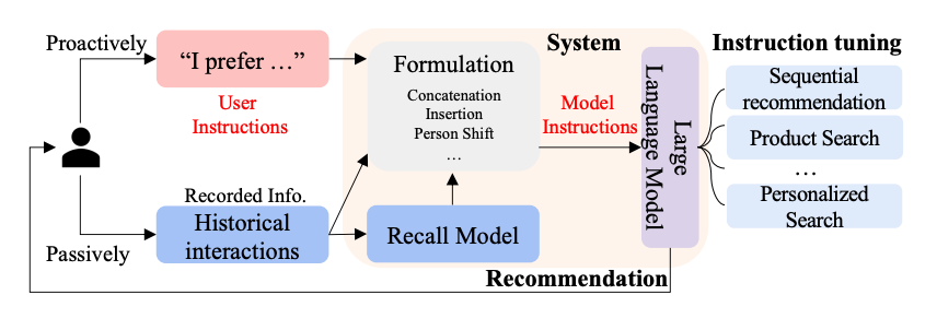 这个论文主要思想是,用户的偏好或需求可以用自然语言描述(称为指令),以便LLMs能够理解并进一步执行指令以满足推荐任务。主要是提出推荐系统的指令调优方法,名为InstructRec。该方法允许用户在与推荐系统交互时,用自然语言指令自由表达他们的信息需求。考虑与用户需求表达相关的三个关键方面,即偏好、意图和任务形式来设计指令。本文采用3B Flan-T5-XL作为骨干型号,Flan-T5基于T5进行了微调。