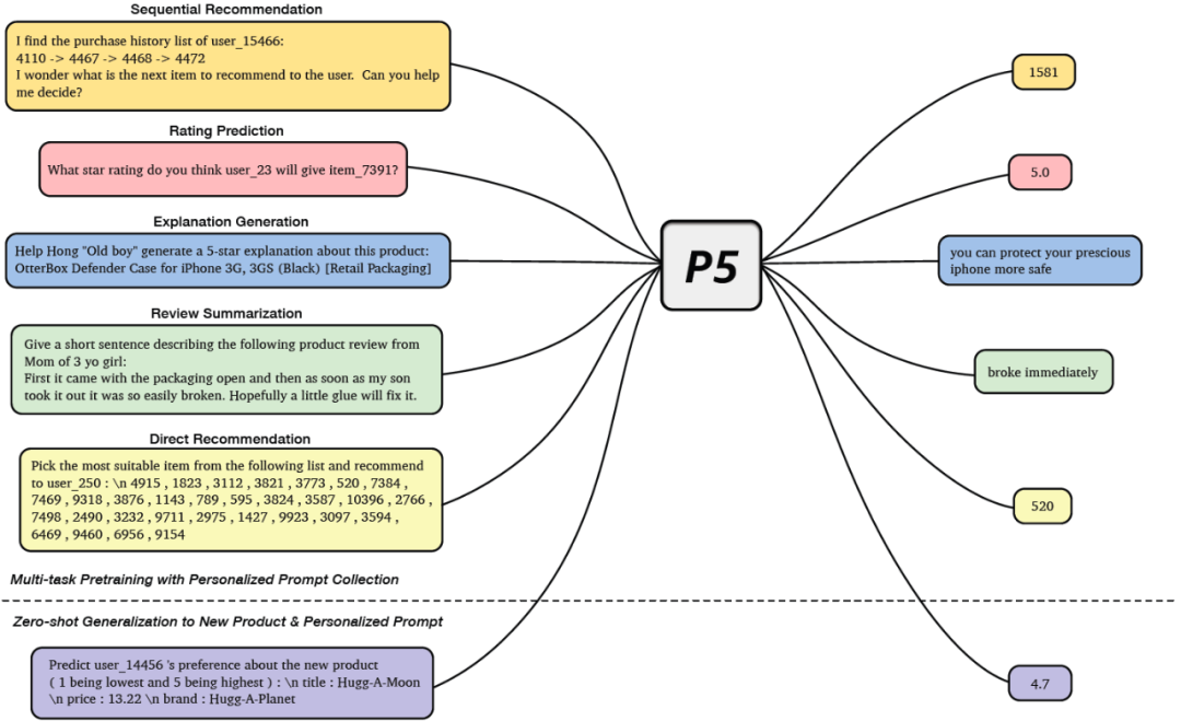 在这个论文中作者提出了一个统一的架构来利用大模型来进行推荐。文章提出来对目前主流的推荐场景(序列推荐、评分预测、可解释性推荐、评论总结等)多个任务都进行了统一,构造了一个模型P5。