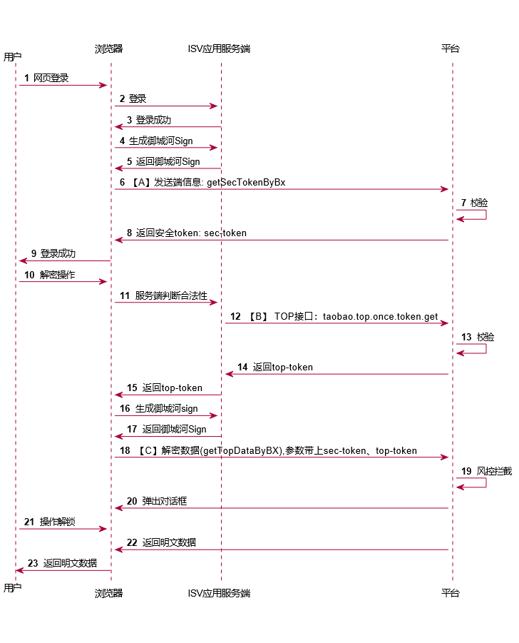 为保护消费者的隐私信息,目前服务商从开放平台获取到的订单信息默认情况下无法获取获取到收货人的敏感信息。但商家在作业时查看订单收货人信息又是一个高频的场景,为了同时能解决敏感信息不被服务商获取以及同时满足商家作业的诉求,平台需要有一个方案能解决数据能直接从商家浏览器来获取消费者信息的能力。